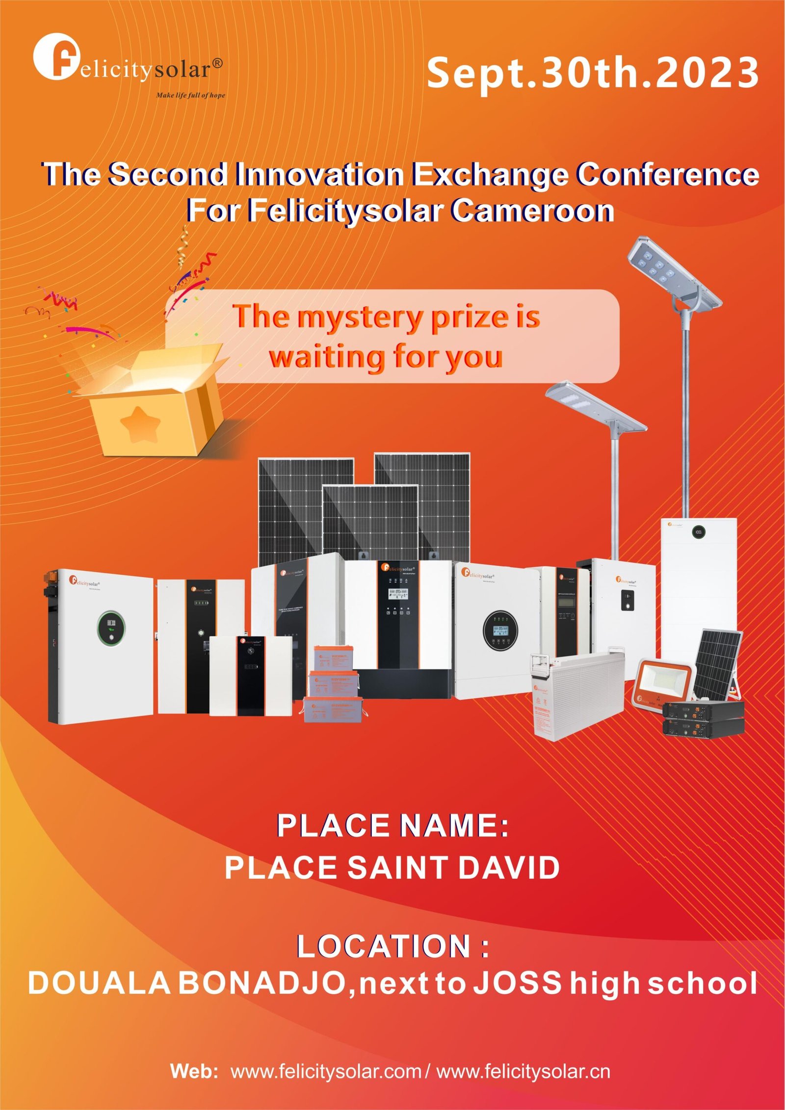Trade show The Second Innovation Exchange Conference for Felicity Solar Cameroon Posted by douha June 16, 2025 On September 30, 2023 0 Introduction Offline communication on solar products. Chance is not too much, look forward to see you then Details One simple step to boost your business Our Professional Custom Service Team is willing to help. Click the button to start! Contact Us CONTACT US If you have any queries, get in touch today! Don't hesitate. We try to take the extra step for our customer satisfaction. First Name* Last Name* Select Country* Choose your country...AfghanistanAustraliaBrazilCanadaFranceGermanyItalySpainSwitzerlandUnited KingdomUnited StatesAland IslandsAlbaniaAlgeriaAmerican SamoaAndorraAngolaAnguillaAntigua and BarbudaArgentinaArmeniaArubaAscension IslandAustriaAzerbaijanBahamasBahrainBangladeshBarbadosBelarusBelgiumBelizeBeninBermudaBhutanBoliviaBosnia and HerzegowinaBotswanaBouvet IslandBritish Indian Ocean TerritoryBritish Virgin IslandsBrunei DarussalamBulgariaBurkina FasoBurundiCambodiaCameroonCape VerdeCaribbean NetherlandsCayman IslandsCentral African RepublicChadChileChinaChristmas IslandCocos (Keeling) IslandsColombiaComorosCongoCook IslandsCosta RicaCote D'ivoireCubaCuraçaoCyprusCzech RepublicKorea,D.P.R.KCongo, The Democratic RepublicDenmarkDjiboutiTimor LesteEcuadorEgyptEl SalvadorEquatorial GuineaEritreaEstoniaEthiopiaFalkland Islands (Malvinas)Faroe IslandsFijiFinlandFrench GuianaFrench PolynesiaFrench Southern TerritoriesGabonGambiaGeorgiaGhanaGibraltarGreeceGreenlandGrenadaGuadeloupe (France DOM-TOM)Guam (U.S.)GuatemalaGuernseyGuineaGuinea-BissauGuyanaHaitiHeard Island and McDonald IslandsHondurasHong Kong, ChinaHungaryIcelandIndiaIndonesiaIran (Islamic Republic of)IraqIrelandIsle of ManIsraelJamaicaJapanJerseyJordanKazakhstanKenyaKiribatiKorea, Republic ofKosovoKuwaitKyrgyzstanLao People's Democratic RepublicLatviaLebanonLesothoLiberiaLiechtensteinLithuaniaLuxembourgMacau, ChinaNorth MacedoniaMadagascarMalawiMalaysiaMaldivesMaliMaltaMarshall IslandsMartinique (France DOM-TOM)MauritaniaMauritiusMayotte (France DOM-TOM)MexicoMicronesia, Federated States ofMoldova, Republic ofMonacoMongoliaMontenegroMontserratMoroccoMozambiqueMyanmarNamibiaNauruNepalNetherlandsNew Caledonia (France DOM-TOM)New ZealandNicaraguaNigerNigeriaNiueNorfolk IslandNorthern Mariana IslandsNorwayOmanPakistanPalauPalestine, State ofPanamaPapua New GuineaParaguayPeruPhilippinesPitcairnPolandPortugalPuerto RicoQatarRéunion (France DOM-TOM)RomaniaRussian FederationRwandaSaint BarthélemySaint HelenaSaint Kitts and NevisSaint LuciaSaint Martin (French part)Saint Pierre and MiquelonSaint Vincent and the GrenadinesSan MarinoSao Tome and PrincipeSaudi ArabiaSenegalSerbiaSeychellesSierra LeoneSingaporeSint Maarten (Dutch part)SlovakiaSloveniaSolomon IslandsSomaliaSouth AfricaSouth Georgia and South Sandwich IslandsSouth SudanSri LankaSudanSurinameSvalbard and Jan MayenSwedenSwitzerlandSyrian Arab RepublicTaiwan, ChinaTajikistanTanzania, United Republic ofThailandTogoTokelauTongaTrinidad and TobagoTunisiaTurkeyTurkmenistanTurks and Caicos IslandsTuvaluUgandaUkraineUnited Arab EmiratesUnited States Minor Outlying IslandsUruguayUzbekistanVanuatuVatican City StateVenezuelaVietnamVirgin Islands (British)Virgin Islands (U.S.)Wallis and Futuna (France DOM-TOM)Western SaharaYemenZambiaZimbabwe Email* Message*